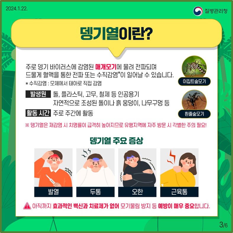 뎅기열은 뎅기 바이러스에 감염된 매개 모기(이집트숲모기, 흰줄숲모기)에게 물려 감염되며, 5~7일의 잠복기 후 발열, 두통, 오한, 근육통 등의 증상이 나타나는 법정 감염병입니다.