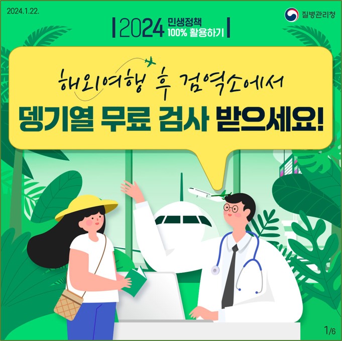 2024년 1월부터는 전국 13개 국립검역소에서 검역 관리지역 입국자 중 모기물림 후 발열, 두통, 근육통 등 뎅기열 의심 증상이 있거나 뎅기열 검사 희망자를 대상으로 뎅기열 신속키트검사를 무료로 실시하고 있습니다.