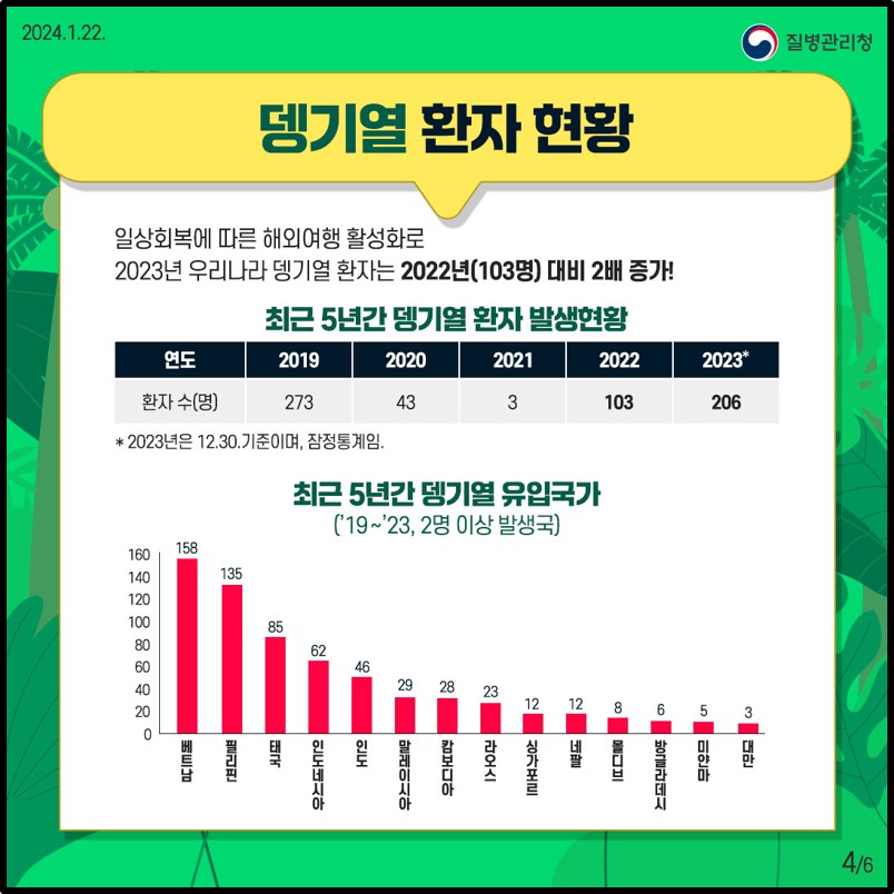 질병관리청은 해외 뎅기열 환자가 계속 증가함에 따라 2023년 12월 1일에 뎅기열을 검역감염병으로 추가 지정하고, 유증상 입국자에 대한 감시를 강화하고 있습니다.